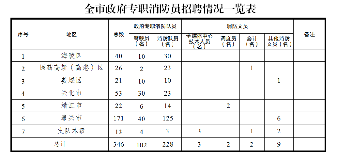 為更好護(hù)航泰州市社會經(jīng)濟(jì)發(fā)展,不斷提升綜合消防救援能力,根據(jù)各地消防救援隊(duì)伍建設(shè)實(shí)際,泰州市消防救援支隊(duì)面向社會公開招聘346名政府專職消防員(附表1)?,F(xiàn)將有關(guān)事項(xiàng)公告如下: